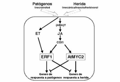 El JA y el ET cooperan o antagonizan en la regulación de diferentes respuestas a estrés, incluyendo la defensa frente a patógenos, heridas (mecánicas o bióticas), exposición a ozono y desarrollo exagerado de la curvatura apical (“hook”) del hipocotilo (Turner et al., 2002; Rojo et al., 2003). La selección de la respuesta más adecuada a cada uno de estos estímulos está determinada en parte por la interacción, positiva o negativa, que se establece entre estas dos rutas de señalización. En el caso de patógenos necrotrofos, por ejemplo, ambas hormonas (ET y JA) sinergizan en la activación de la expresión de genes de defensa (Xu et al., 1994; Penninckx et al., 1998), y los mutantes afectados en la síntesis o señalización de cualquiera de estas dos hormonas son incapaces de inducir estas respuestas de defensa y son más susceptibles al ataque de los patógenos (Knoester et al., 1998; Vijayan et al., 1998; Staswick et al., 1998; Thomma et al., 1998; 1999). Sin embargo, en respuesta a heridas provocadas por fitófagos o daño mecánico estas dos rutas de señalización antagonizan en la activación de defensas (Rojo et al., 1999; 2003). Aunque actualmente los mecanismos moleculares que subyacen a estas interacciones son poco conocidos, la identificación de nuevos componentes de estas rutas, como ERF1 y AtMYC2, está facilitando su comprensión.
