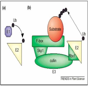 El proteosoma 26S puede definirse como un complejo enzimático que degrada proteínas ubiquitinadas en un proceso dependiente de ATP. El complejo se divide en dos partículas, el proteosoma 20S que contiene los lugares activos de proteolisis y la partícula reguladora 19S compuesta de varias subunidades designada como RPT (regulatory particle triple A-ATPase) (Finley et al., 1998). La degradación de los sustratos específicos está precedida por un mecanismo de ubiquitinación que tiene lugar por la formación de un enlace covalente, dependiente de ATP, entre la proteína y un péptido muy conservado de 76 aminoácidos llamado ubiquitina. Este proceso requiere la actividad de la enzima activadora de ubiquitina E1, de la enzima conjugadora de ubiquitina E2 y finalmente una ubiquitin-ligasa E3. La ligasa E3 del tipo SCF forma a su vez el denominado complejo SCF, junto con las proteínas culina y RBX1, que puede asociarse con distintas combinaciones de proteínas SKP1 y F-box que funcionan como receptores de los sustratos a degradar (Figura 2). En Arabidopsis existen mas de 700 proteínas F-box distintas (Risseeuw et al., 2003), muchas más que en otros organismos complejos similares de diferentes reinos, lo que pone de manifiesto la importancia que juega la regulación de la degradación de proteínas en la señalización de plantas.